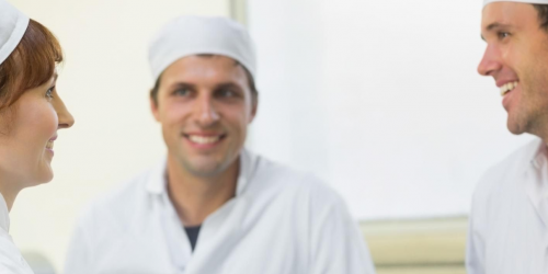 Foto van Hoogvliet: Gerald en Ron die met een collega een product keuren In de hypermoderne bakkerij in Bleiswijk produceert en verwerkt Hoogvliet met vakmanschap en ambacht per uur ruim 24.000 broodjes en 7.000 broden. Om de productkwaliteit hoog te houden is er geïnvesteerd in trainingen. “Een belangrijk onderdeel van ons bel...