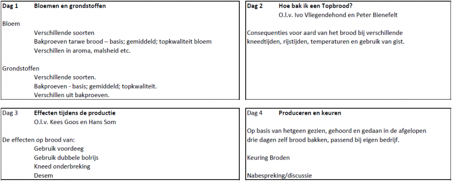 Meester Boulanger Peter Bienefelt is 4 dagen gastheer en verzorgt tevens 2 dagdelen training. Naast informatie en training over de werking van grondstoffen delen verschillende toppers uit de branche hun ervaring, kennis en kunde en passie tijdens deze training. Trainers: Kees Goos, Peter Bienefelt, Ivo Vliegendehond, Hans Som, e.a.